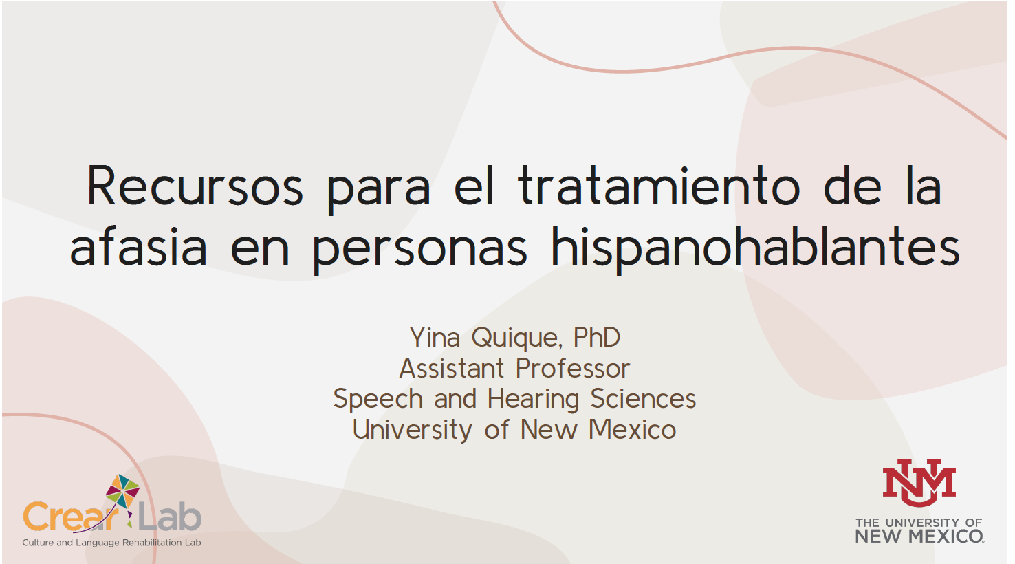 Quique, Y. (2025). Aphasia rehabilitation for Spanish speakers with aphasia: insights from the US, Peru, and Colombia. Clinical Aphasiology Conference. Albuquerque, NM. NIDCD Research Symposium in Clinical Aphasiology (RSCA): Invited Speaker