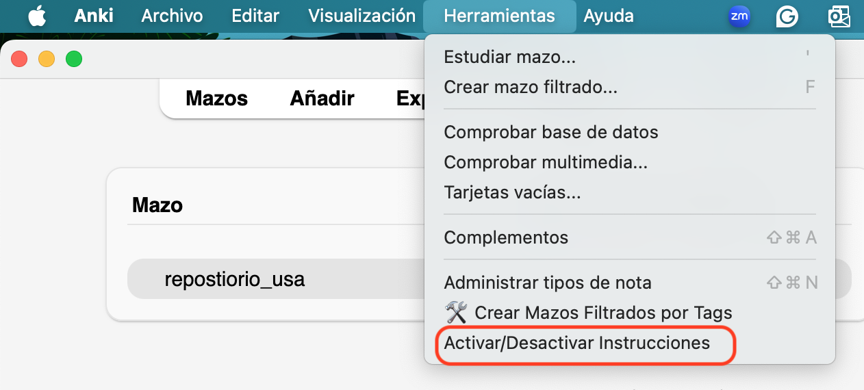 Ustedes pueden seguir estos pasos directamente desde su computador activando las instrucciones en Anki (también las pueden desactivar una vez que hayan memorizado cada paso). Para activar las instrucciones den clic en herramientas y después den clic en la opción de Activar/Desactivar Instrucciones.
